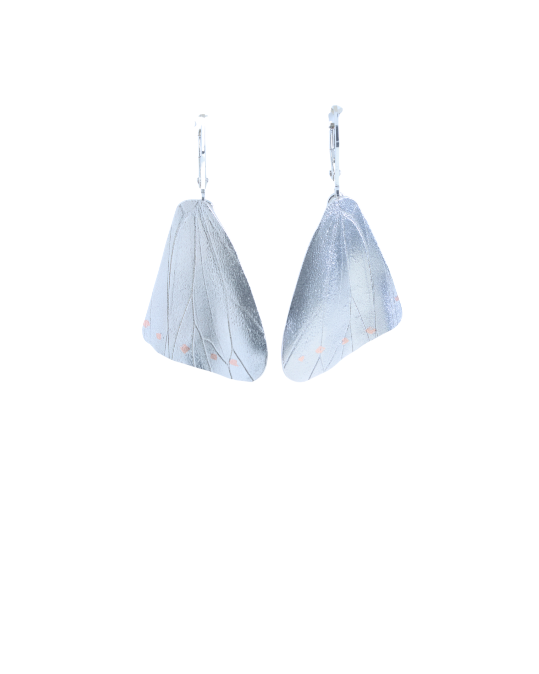 De vleugels hangen speels en bewegen subtiel, bevestigd aan een groot gesloten haakje. De afmetingen van de vleugel zijn 24 x 32 mm, waardoor de oorbellen een opvallende en elegante uitstraling hebben.