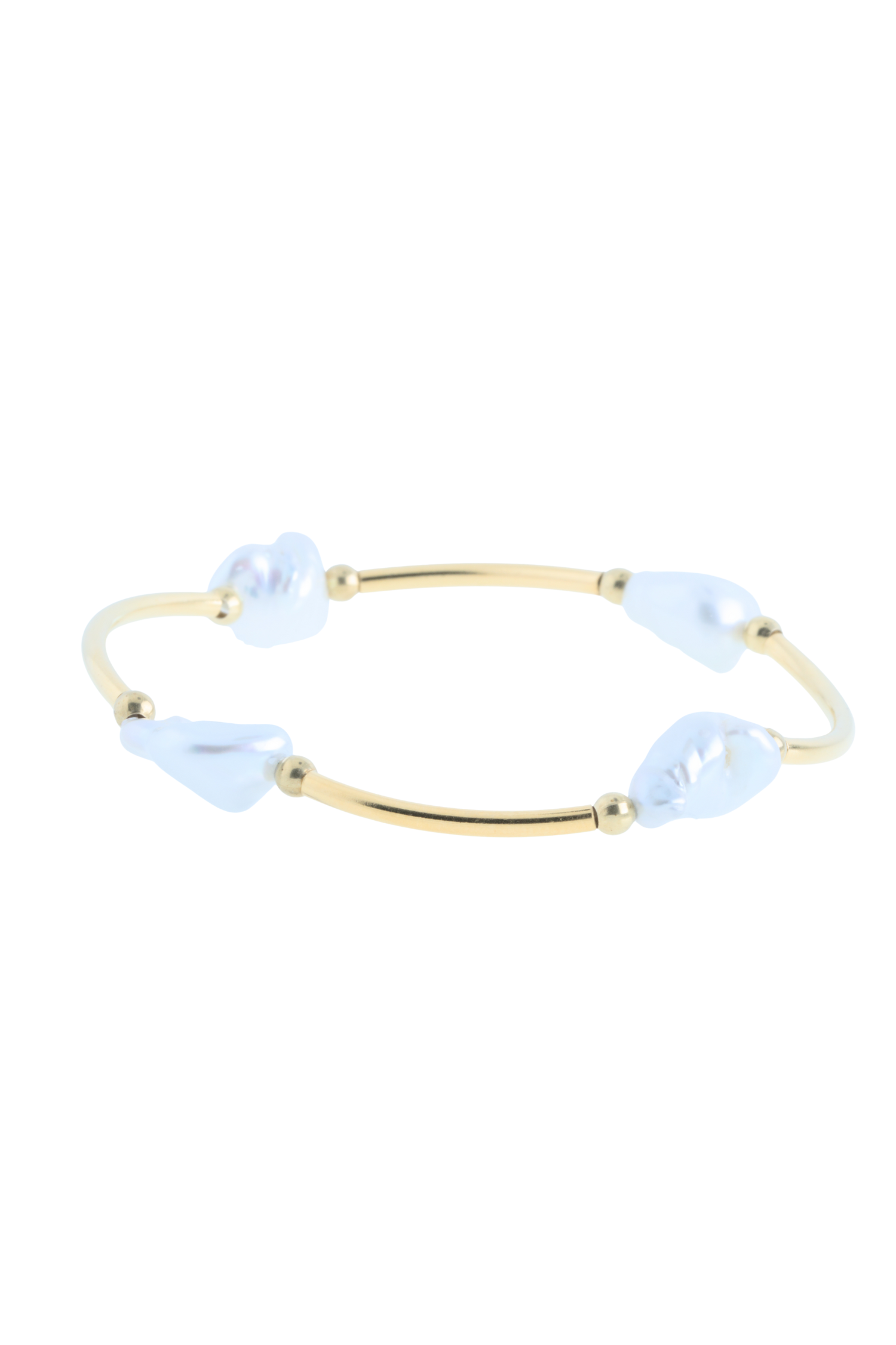 Deze verfijnde armband voegt een elegante zachtheid toe aan de collectie. De blikvanger is een witte Keshi parel van 12 x 8 mm, geliefd om haar natuurlijke grillige vorm en subtiele glans. Elke parel is uniek, waardoor geen twee armbanden ooit exact hetzelfde zijn.