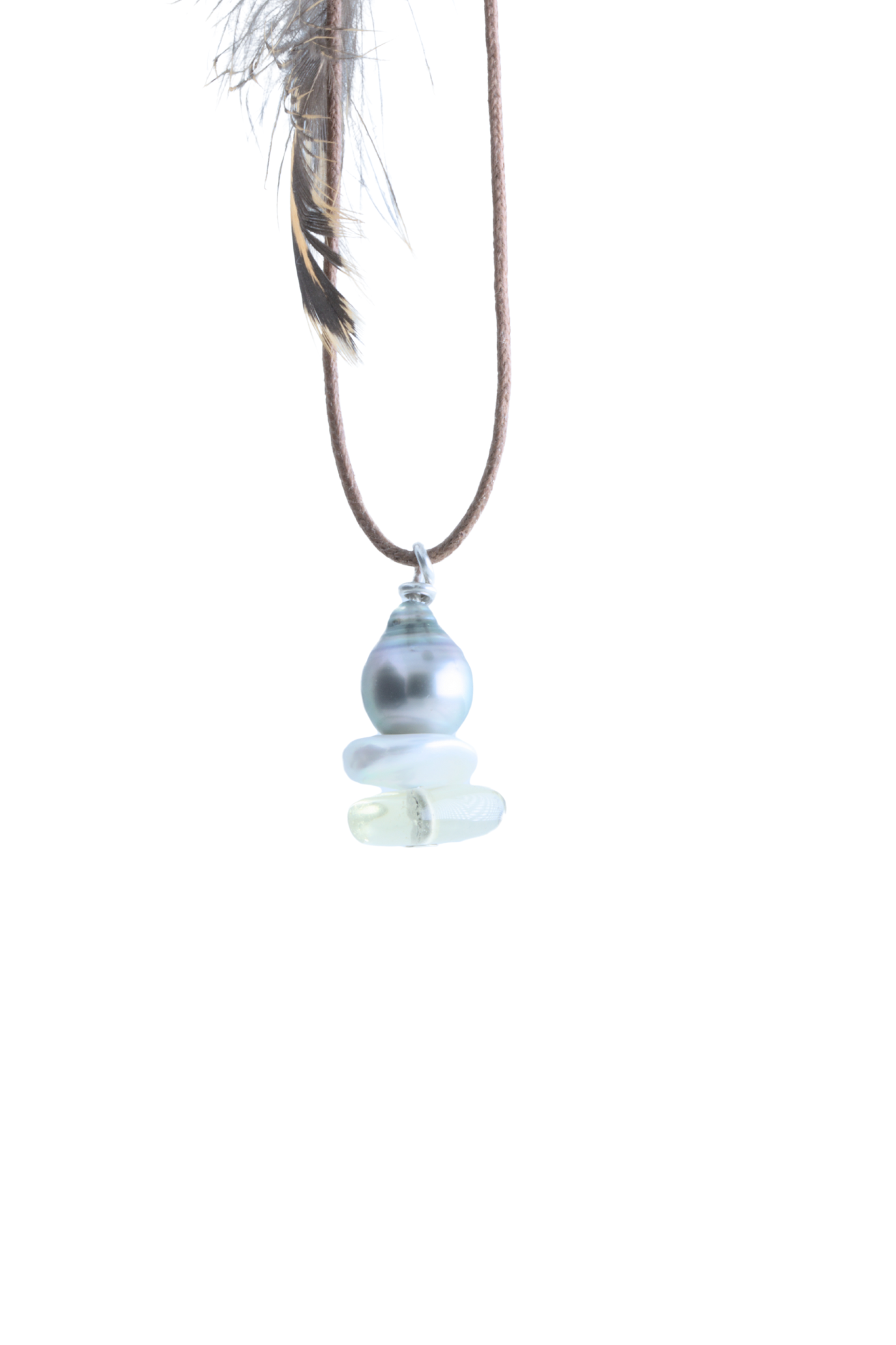 Deze eenvoudige hanger is ontworpen als een subtiel en persoonlijk herinneringssieraad. Geïnspireerd door de natuur en de stenen die we aan het strand vinden, zijn drie halfedelstenen – citrien, Tahiti parel en Keshi parel – speels gestapeld en verbonden met zilver. De hanger meet 2,5 x 1,1 cm en wordt geleverd aan een katoenen lintje met surfknoop, voor een natuurlijke en nonchalante look.