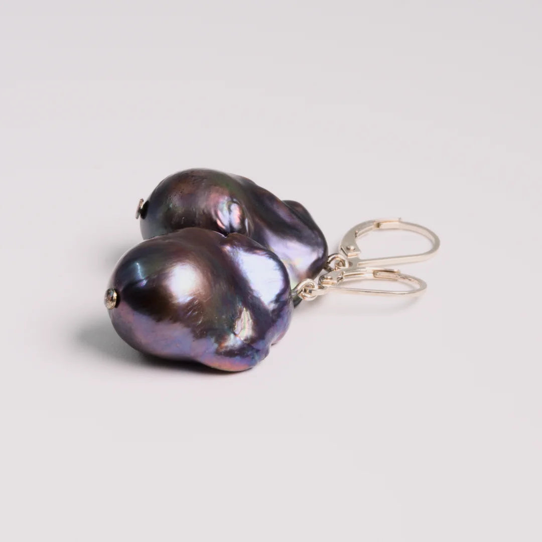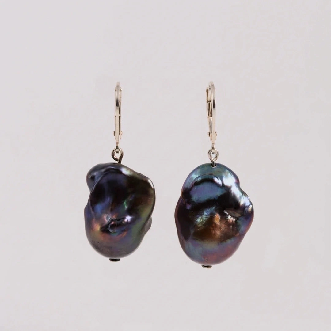 De parels hangen aan een eenvoudig, fijn oorbelhaakje van 925 zilver (of goud, naar keuze), waardoor de focus volledig op de parel blijft liggen. De donkere tinten in de parel variëren van diep pauwenblauw tot mystiek grijs en groen, waardoor ze bij elke beweging een andere kleur lijken te vangen.